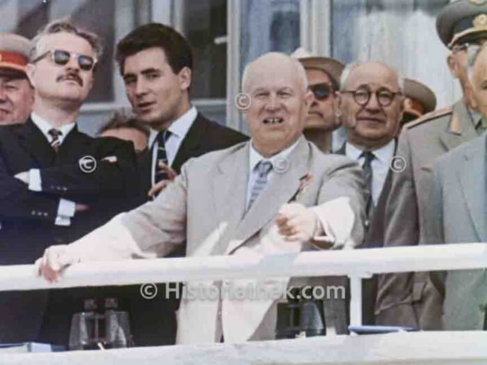 Nikita Chruschtschow beobachtet die Darbietungen der sowjetischen Piloten beim Tag der Luftfahrt 1962 auf dem Flughafen Tushino. Sein zufriedener Ausdruck verrät spürbaren Stolz.