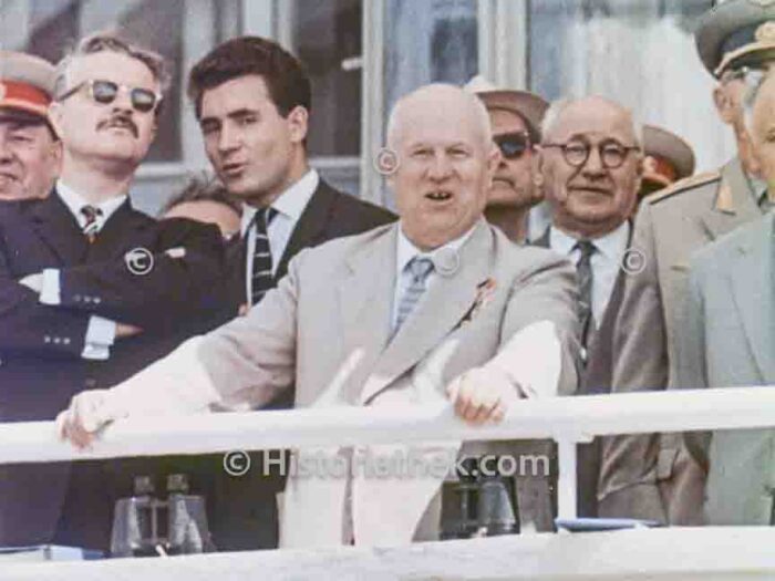 Nikita Chruschtschow beobachtet die Darbietungen der sowjetischen Piloten beim Tag der Luftfahrt 1962 auf dem Flughafen Tushino. Sein zufriedener Ausdruck verrät spürbaren Stolz.