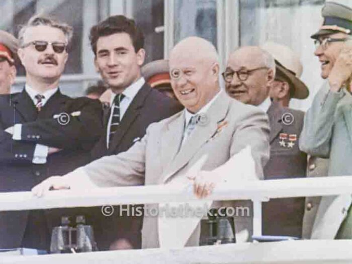 Nikita Chruschtschow beobachtet die Darbietungen der sowjetischen Piloten beim Tag der Luftfahrt 1962 auf dem Flughafen Tushino. Sein zufriedener Ausdruck verrät spürbaren Stolz.