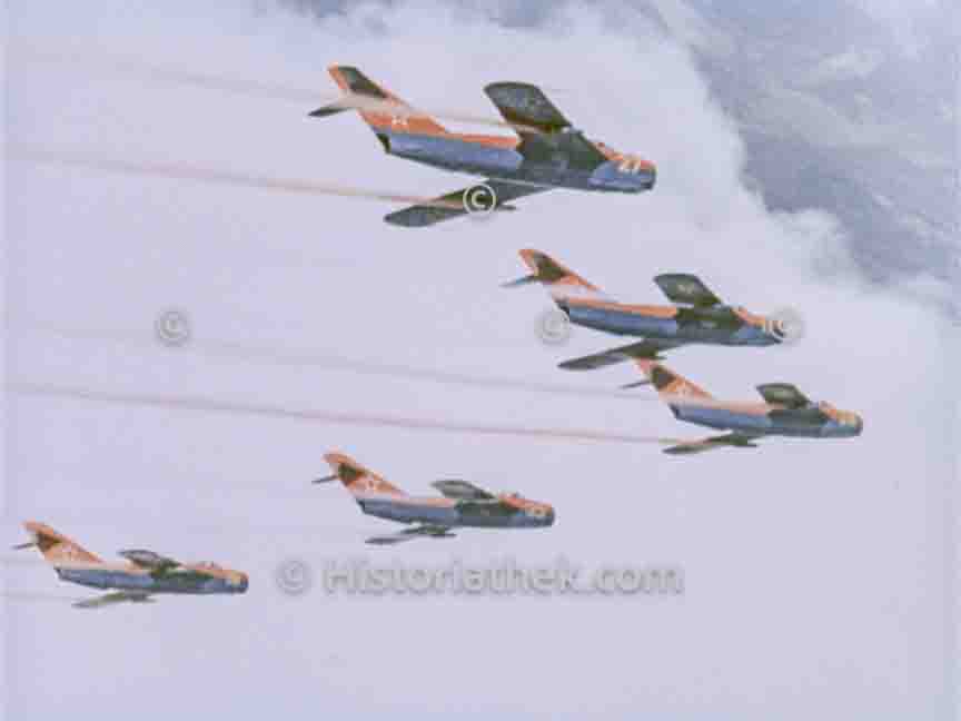 Eine Kunstflugstaffel von 5 MIG 15 am Tag der sowjetischen Luftfahrt in Tushino bei Moskau 1962. #Photography HT-Foto00091672-33 from 1962