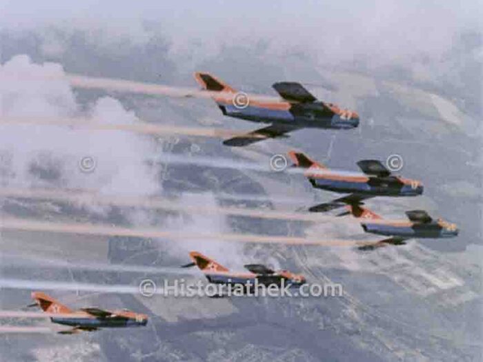 Eine Kunstflugstaffel von 5 MIG 15 am Tag der sowjetischen Luftfahrt in Tushino bei Moskau 1962. #Photography HT-Foto00091728-34 from 1962