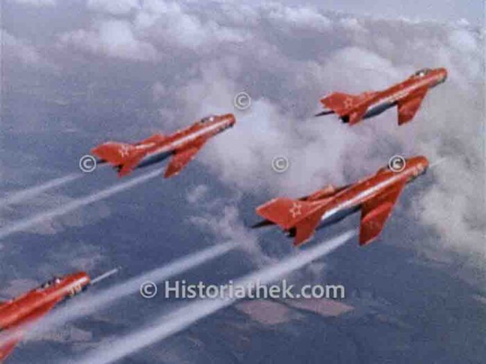 Die Aufnahme zeigt sowjetische MiG-19 „Farmer“ der Kunstflugstaffel während der Flugschau zum Tag der sowjetischen Luftfahrt in Tushino, Moskau, 1962. Die Maschinen befinden sich in einem dynamischen Kunstflugmanöver, wie sie typisch für die Präsentationen der sowjetischen Luftstreitkräfte dieser Zeit waren. Die MiG-19, eines der ersten in Serie produzierten Überschalljagdflugzeuge der UdSSR, wird hier als wendiges und leistungsstarkes Demonstrationsflugzeug präsentiert. Die Flugschau diente der öffentlichen Zurschaustellung technischer Fortschritte und militärischer Stärke der sowjetischen Luftfahrt in den frühen 1960er Jahren.