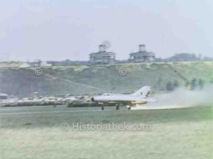 Eine MiG-21 Fishbed C hebt mit zugeschaltetem Zusatzraketenschub ab. Die Startraketen erzeugen markante Flammen am Heck des Jets. #Photography HT-Foto00103402-76 from 1962