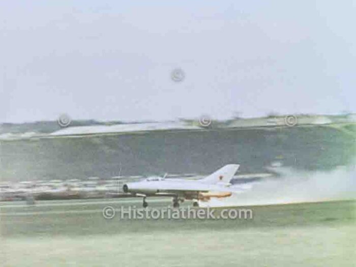 Eine MiG-21 Fishbed C hebt mit zugeschaltetem Zusatzraketenschub ab. Die Startraketen erzeugen markante Flammen am Heck des Jets. #Photography HT-Foto00103419-77 from 1962