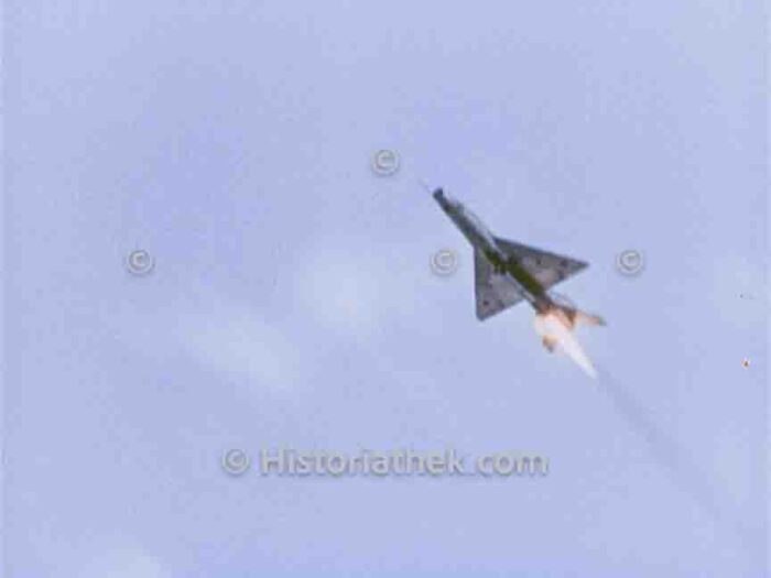 Mit aktiviertem Zusatzraketenschub zieht die sowjetische MiG-21 Fishbed C steil nach oben und hinterlässt einen hellen Flammenschweif.