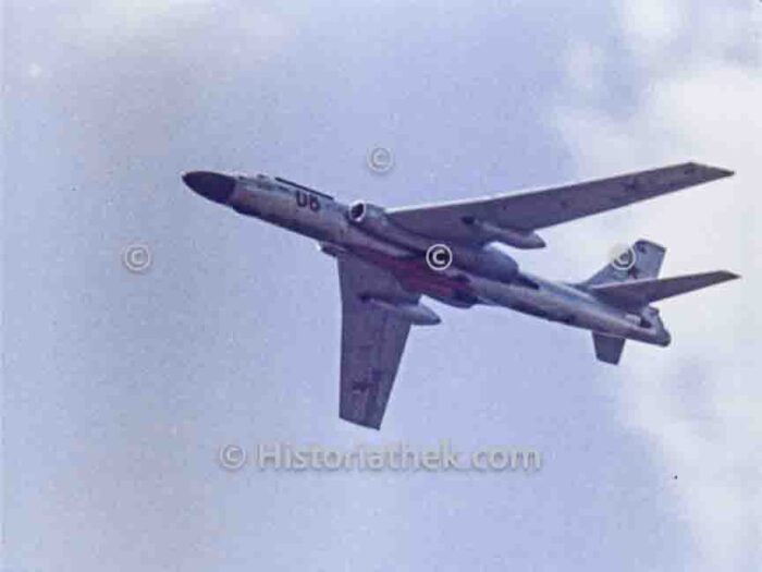 Die Tupolew Tu-16 Badger, einer der wichtigsten sowjetischen Langstreckenbomber, passiert das Gelände der Tushino-Flugschau 1962 im kraftvollen Tiefflug.
