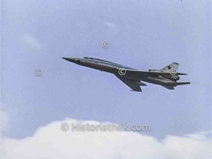 Die Tupolew Tu-22KD Blinder, ein sowjetischer Überschallbomber, präsentiert sich im Flug – erkennbar an ihrem schlanken Rumpf und den seitlich angeordneten Triebwerken. #Photography HT-Foto00100184-60 from 1962