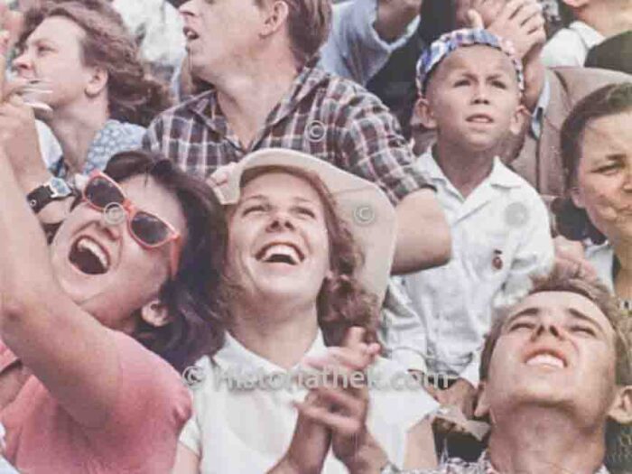 Publikum am Flughafen Tushino in Moskau, das 1962 die spektakulären Vorführungen zum Tag der sowjetischen Luftfahrt beobachtet.